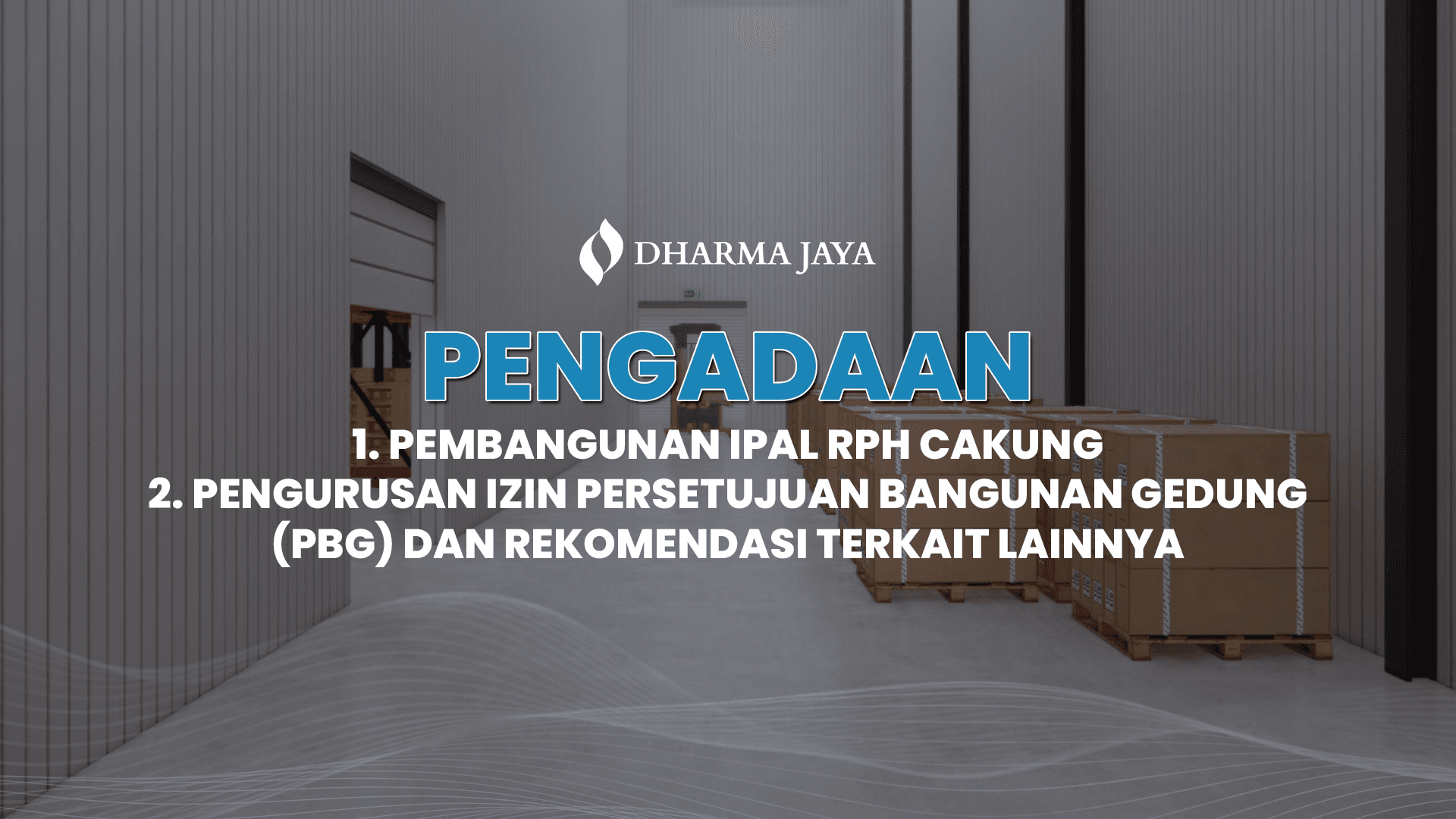 Perumda Dharma Jaya ingin menginformasikan kepada perusahaan Bapak/Ibu bahwa saat ini kami sedang dalam pencarian Penyedia Barang dan Jasa Pembangunan IPAL RPH Cakung dan Pengurusan Izin Persetujuan Bangunan Gedung (PBG) untuk pembangunan Cold Storage di tempat kami Jl. Penggilingan Raya No. 25, Cakung, Jakarta Timur.